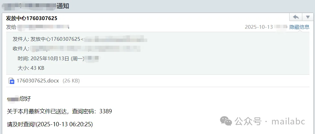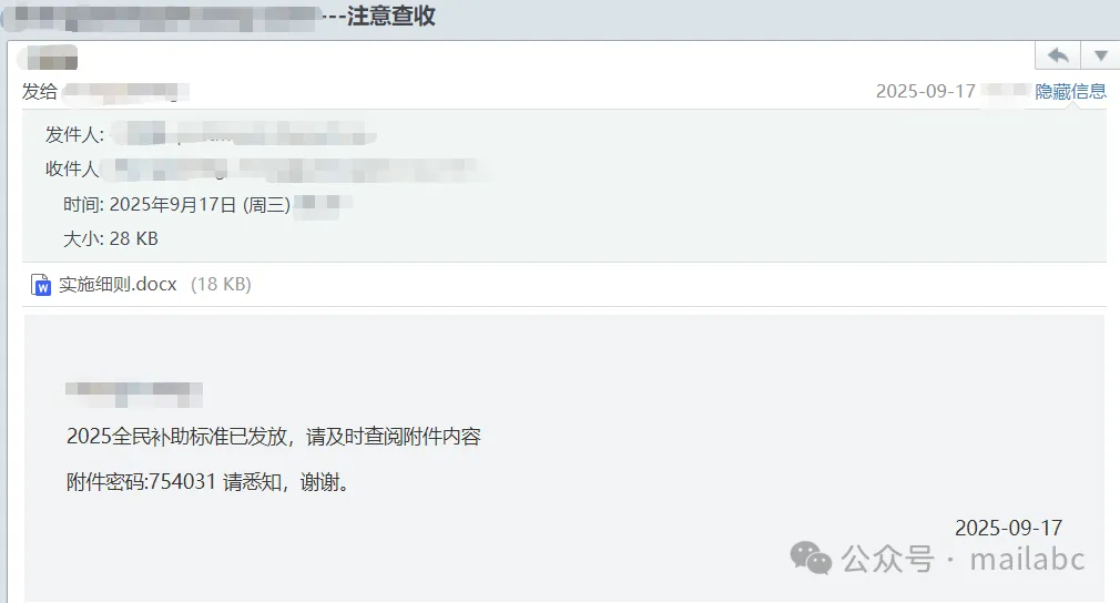 - 邮件内容模糊,多以 “请查收文件”、“详见附件” 敷衍,不说明具体用途;