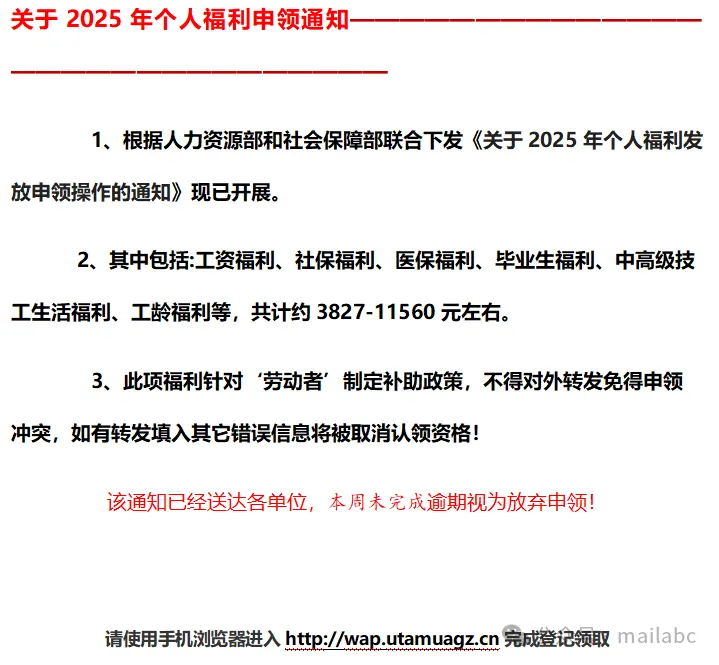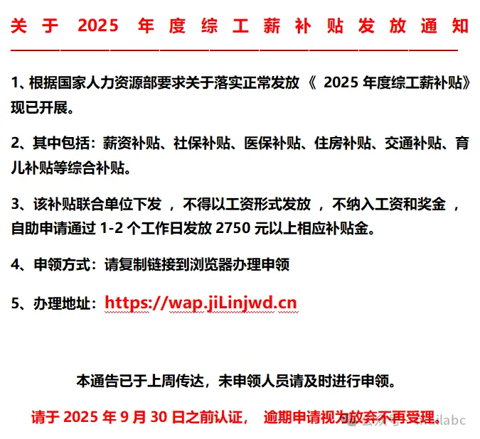 - 用 “待领补贴”“福利补发现金” 为诱饵,加 “24 小时失效” 制造焦虑。