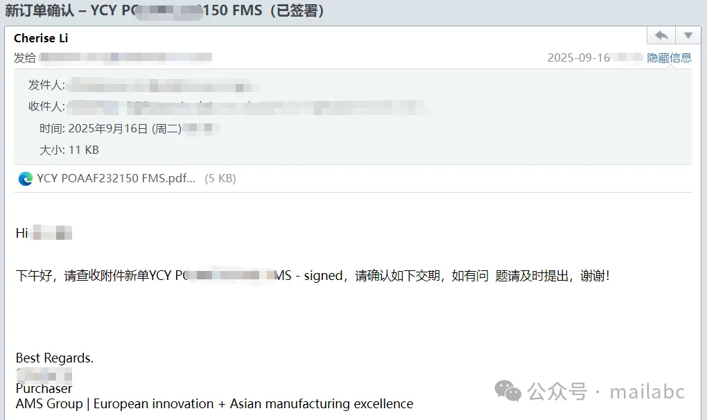 预防此类钓鱼邮件的关键是核对客户邮箱域名是否与历史合作一致;变更付款信息必电话、视频二次确认;不打开陌生订单附件,先扫描病毒。
