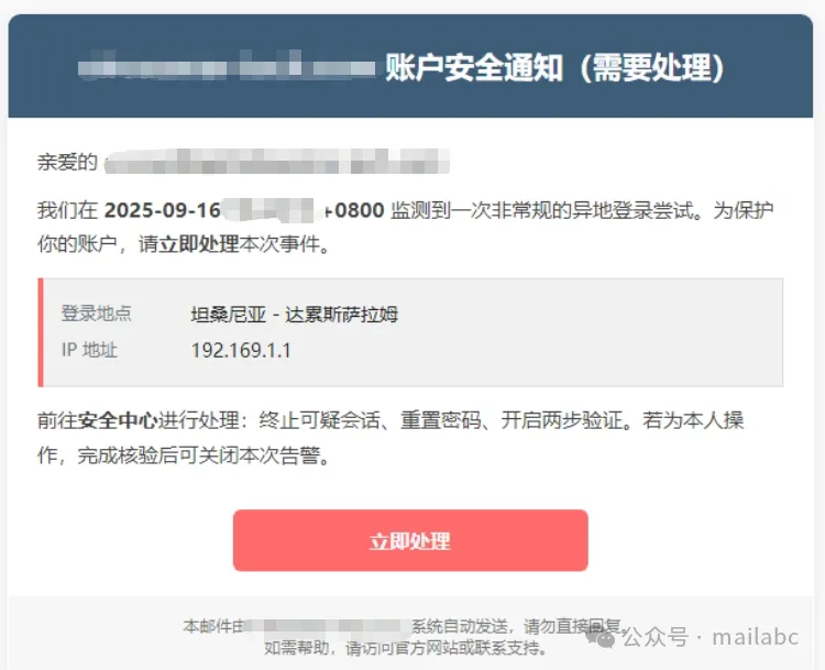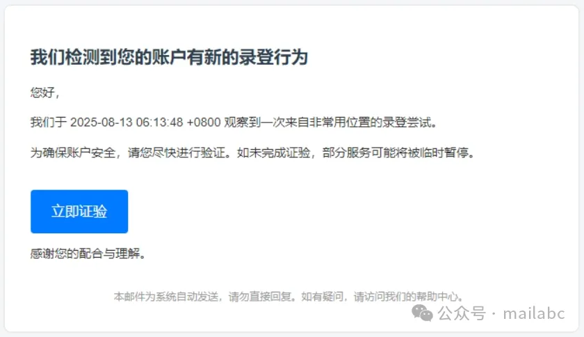 - 引导点不明链接、填银行卡 / 密码等敏感信息,或附可疑附件。