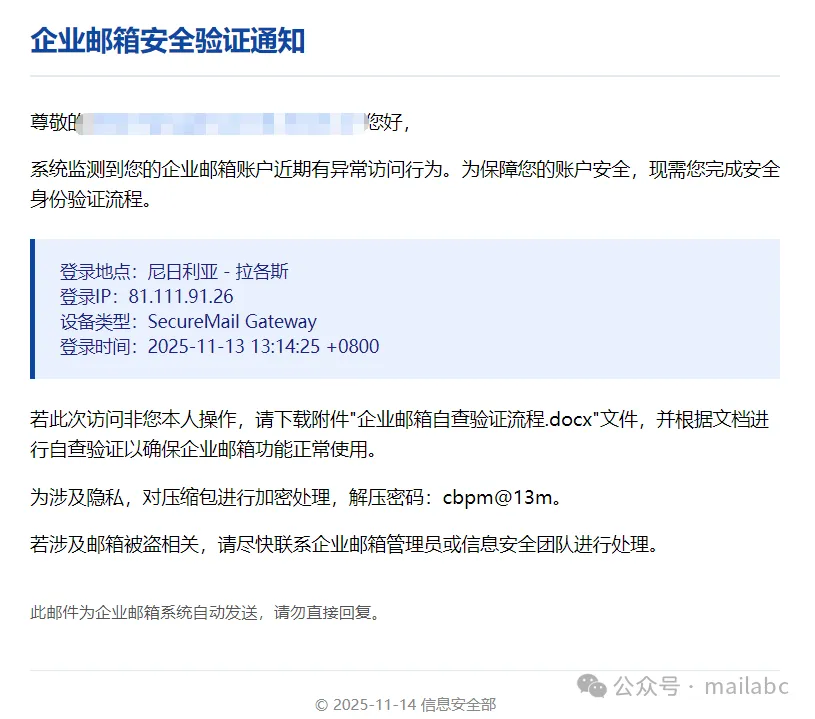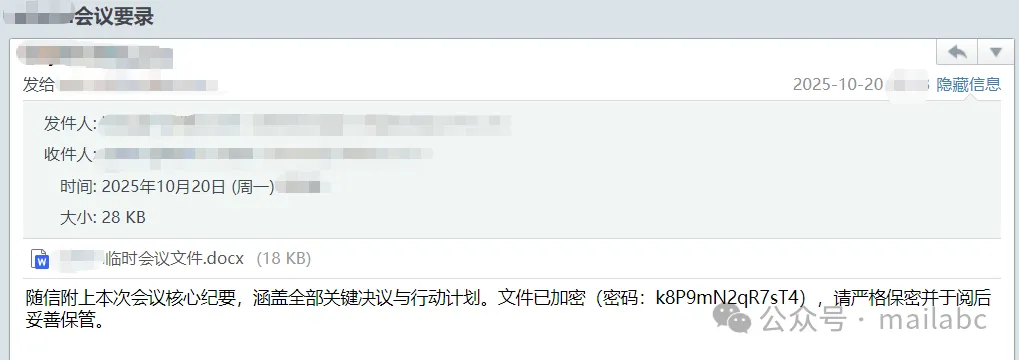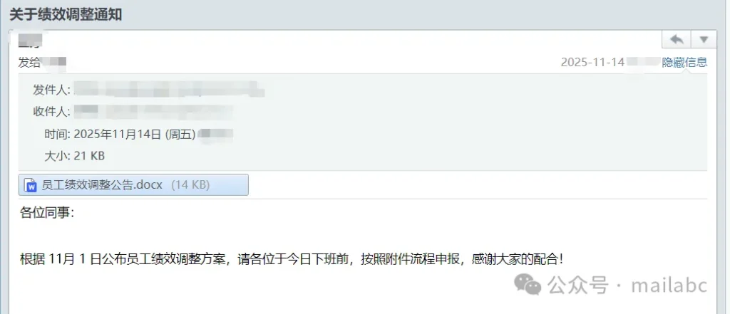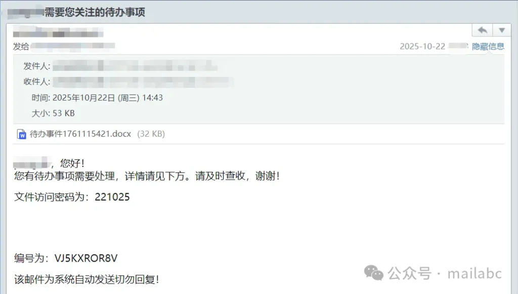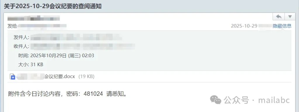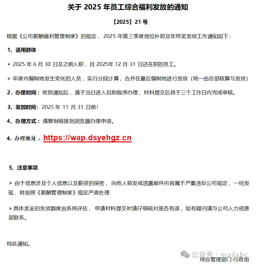 福利补贴类钓鱼邮件的核心特征是借 “福利发放” 诱导点击链接或提交信息,其标题常含福利、补贴、奖金等关键词,发件人会伪装成 HR、行政部门或 “公司福利中心” 但邮箱地址非企业官方域名。近期这类钓鱼邮件较为常见,通常伪装成绩效考核通知、会议纪要查阅通知、待办事项等主题,邮件正文会提供附件密码,而附带密码的附件中暗藏钓鱼链接,诱导收件人点击操作。
