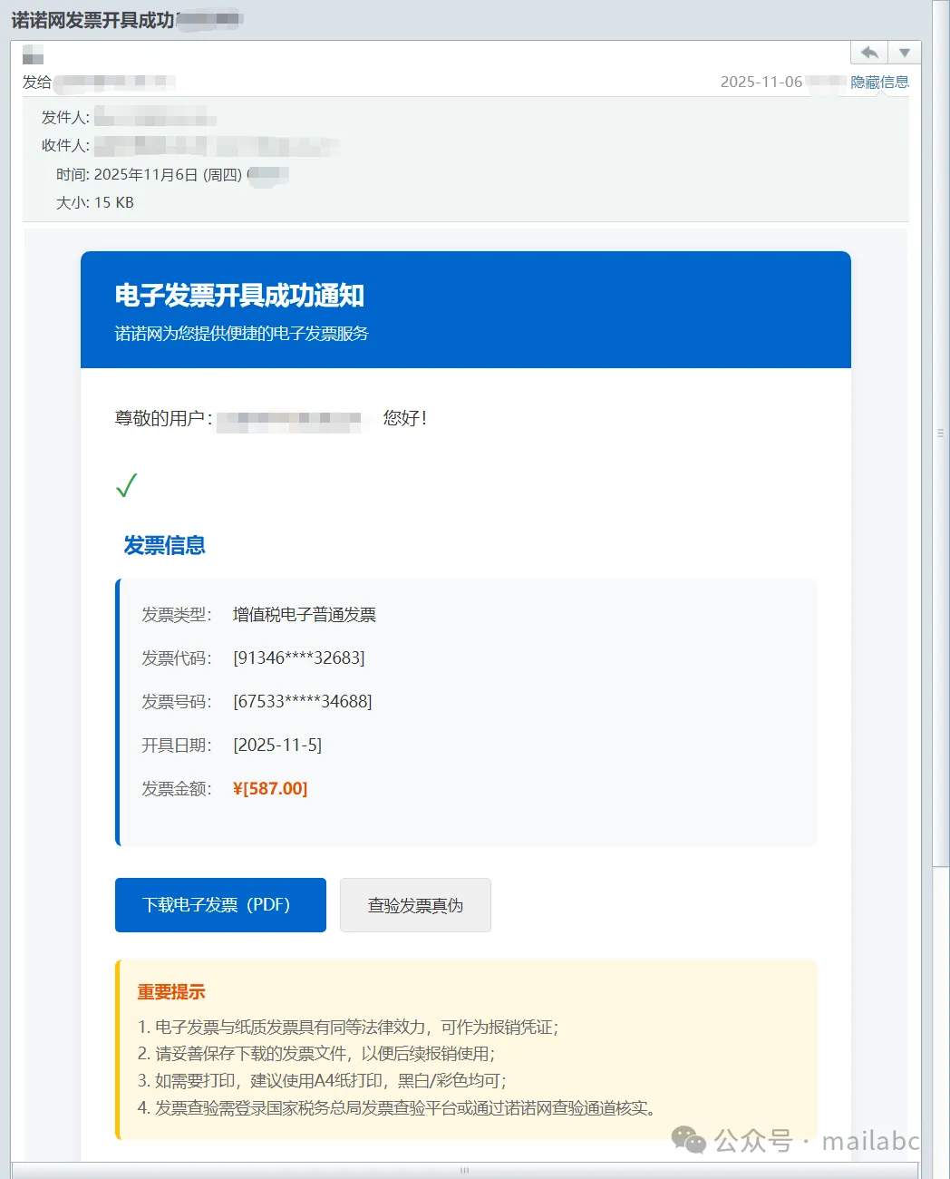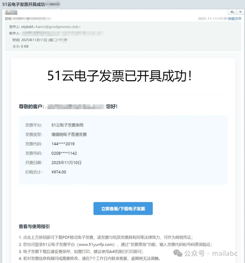 电子发票相关钓鱼邮件多伪装商家、税务或快递方,发件人是仿冒域名邮箱,常盗用品牌 Logo 与格式。主题围绕发票下载、付款、审核或 “即将过期” 制造紧迫感,正文附附件或链接,附件可能是带密码的恶意压缩包、伪装 PDF(含隐藏链接、二维码),链接跳转仿冒页面,诱导输入账号、密码等敏感信息,部分还含虚假客服电话套取信息。