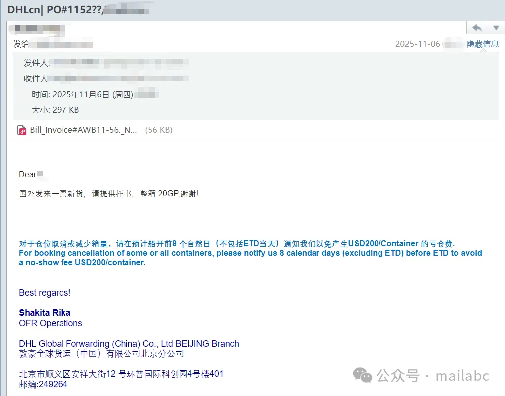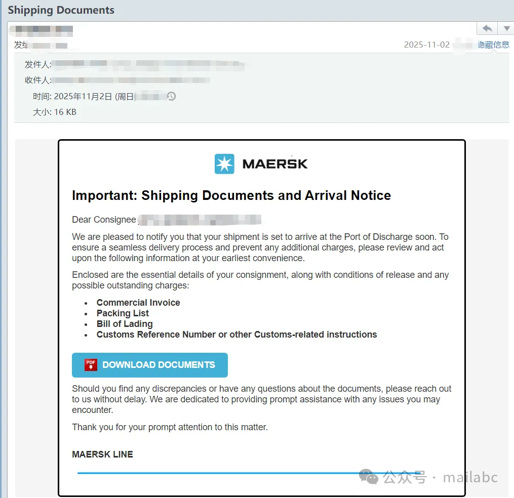 物流相关钓鱼邮件常伪装快递公司,发件人是仿冒域名邮箱,主题含快递异常、物流装箱单等。正文附钓鱼链接或带密码的附件,声称点击链接、解压附件可查询物流、办理退款或重新发货,实则诱导输入手机号、银行卡号等敏感信息,或植入恶意程序窃取数据。