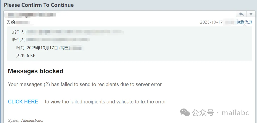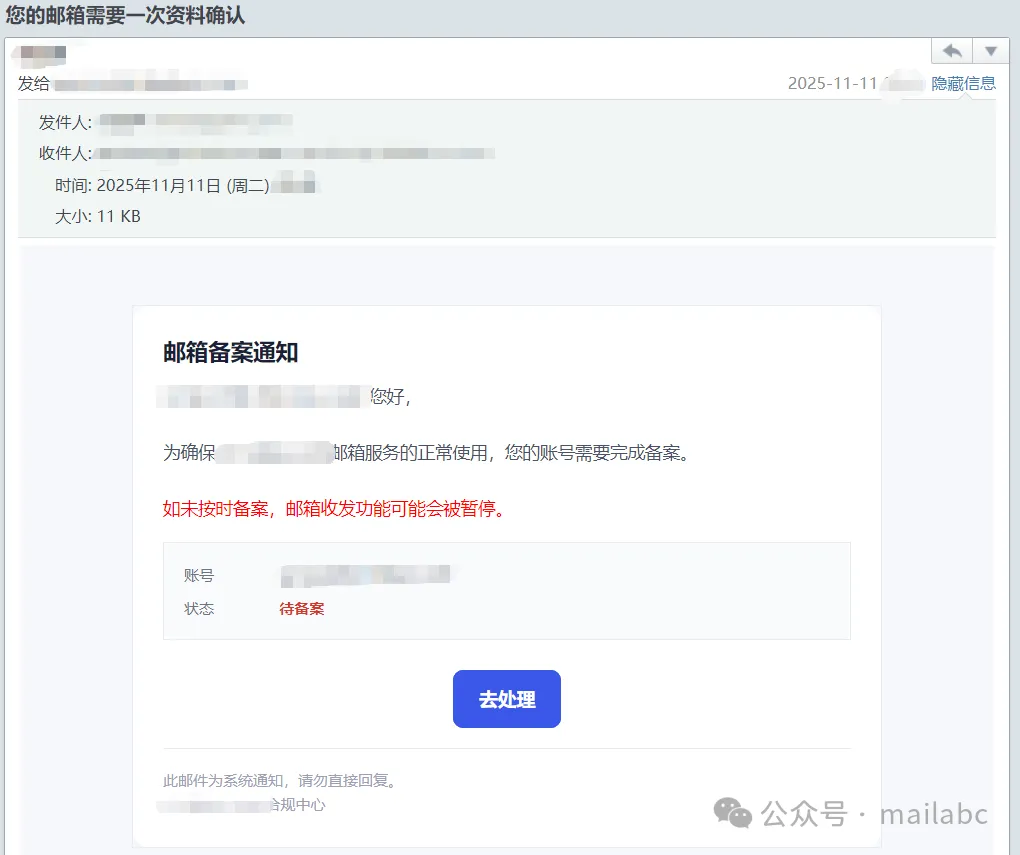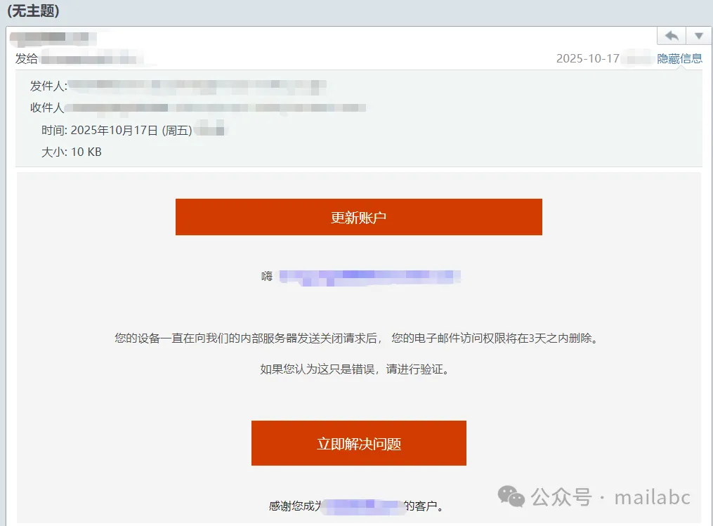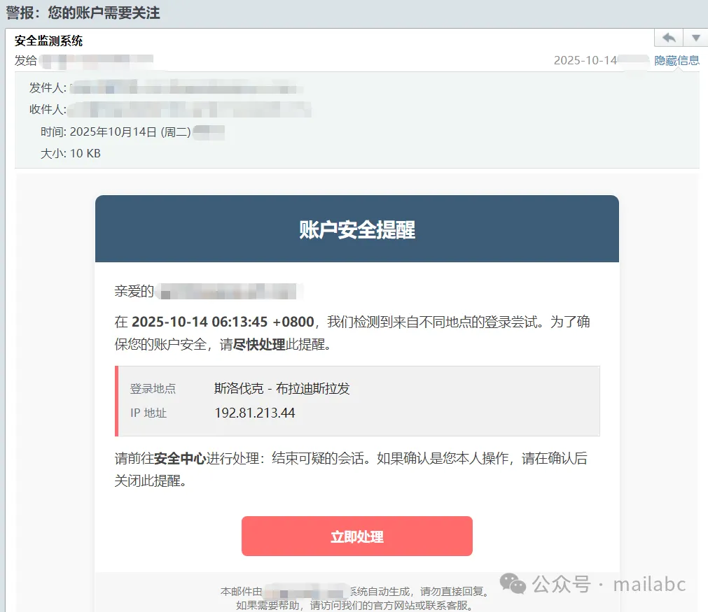 邮件投递异常相关钓鱼邮件常伪装邮件服务商,发件人是仿冒域名邮箱。主题含邮件投递失败、未成功发送、需验证激活等,部分用 “限时处理否则封号” 制造紧迫感。正文附钓鱼链接或附件,声称点击可查询详情、重新发送或验证账号,实则诱导输入邮箱密码、手机号等敏感信息。
