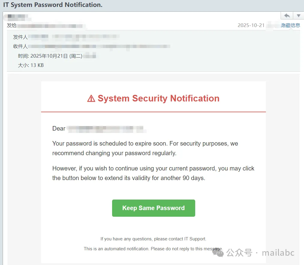 这类钓鱼邮件十分常见,往期已多次科普。本期将继续分享相关样本,方便大家参考甄别。
