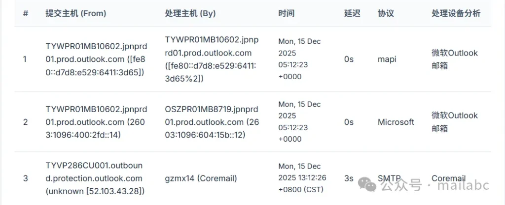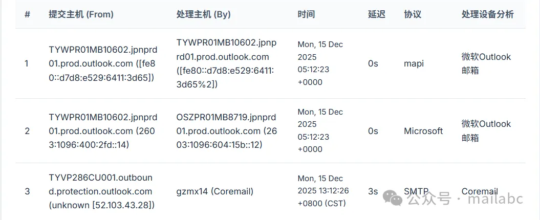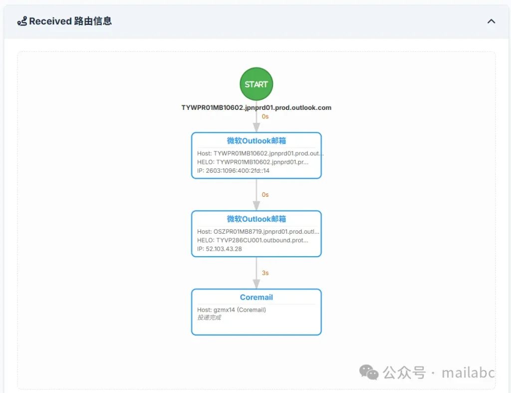 信头分析工具可基于信头路由信息(Received)中的关键字,自动识别处理节点的主机类型与品牌、HELO 信息、出口 IP,以及节点间的邮件传输耗时。该工具能直观呈现邮件完整路由轨迹,大幅降低用户的使用门槛。采用图形化的方式进行展示,如下图所示: