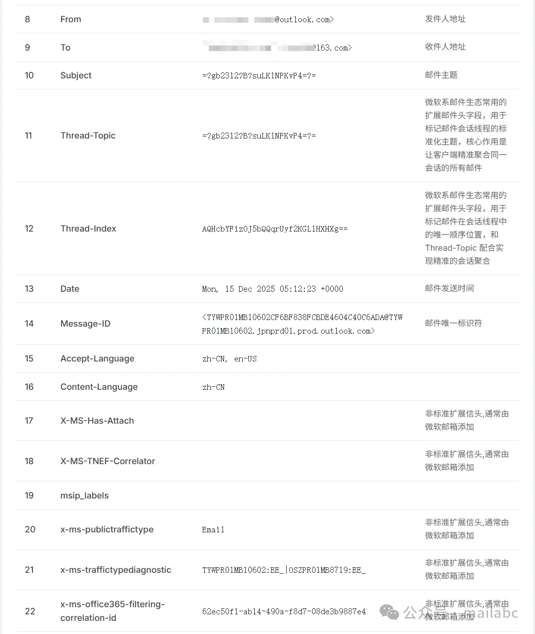 信头分析工具可对信头内容进行逐项解析,并以表格形式呈现各信头字段的含义。后续我们将持续优化该功能,力求覆盖所有常见信头字段的释义。以下为部分功能示例: