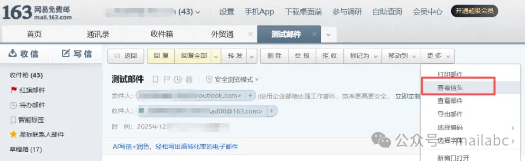 进入网易163邮箱,打开一封邮件,单击“更多 – 查看信头”即可。