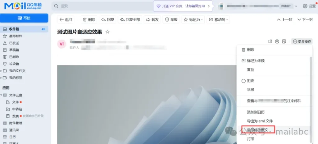 进入腾讯QQ邮箱,打开一封邮件,单击右侧“更多操作 – 显示邮件原文”即可。