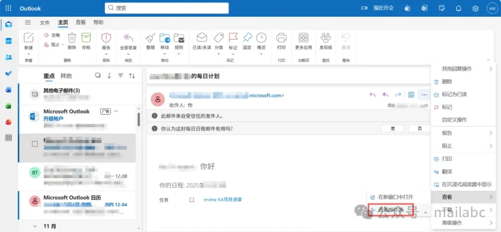 进入微软Outlook邮箱,打开一封邮件,单击右侧“更多操作 – 查看 – 查看邮件源”即可。