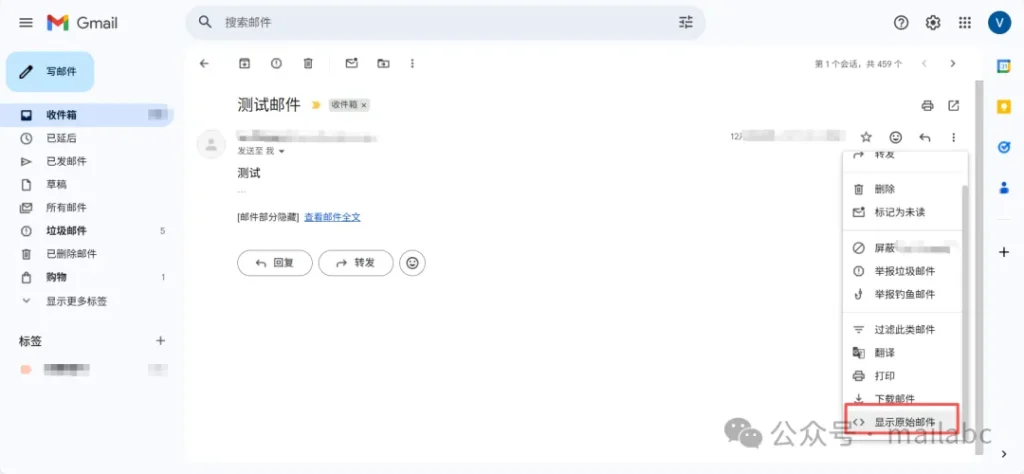 进入谷歌Gmail邮箱,打开一封邮件,单击右侧“更多 – 显示原始邮件”即可。