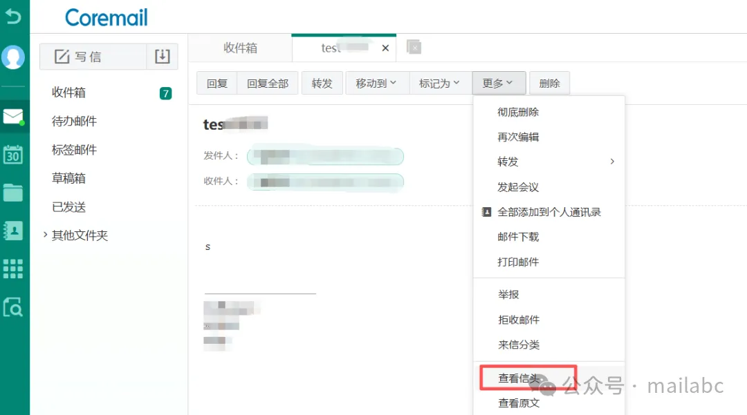 针对企业级用户,以Coremail邮箱为例,可以进入Web邮箱界面,打开一封邮件,单击“更多 – 查看信头”即可。